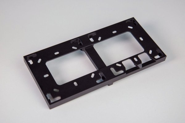 Divvietīgs montāžas rāmis, kas ļauj blakus instalēt divas ierīces (piem., Touch + NFC). Sudraba apdare piešķir tīru un profesionālu izskatu; rāmis vienkāršo simetrisku uzstādīšanu un slēpj montāžas elementus, atvieglojot gan uzstādīšanu, gan apkopi.