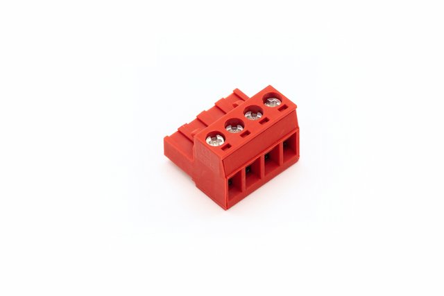 4-polu terminālis sarkanā izpildījumā lietojams kombinētām barošanas un signālu ķēdēm; krāsa atvieglo operācijas un apkopi. Ieteikums — uzzīmēt pin-to-funkciju shēmu pie paneļa priekšpuses.